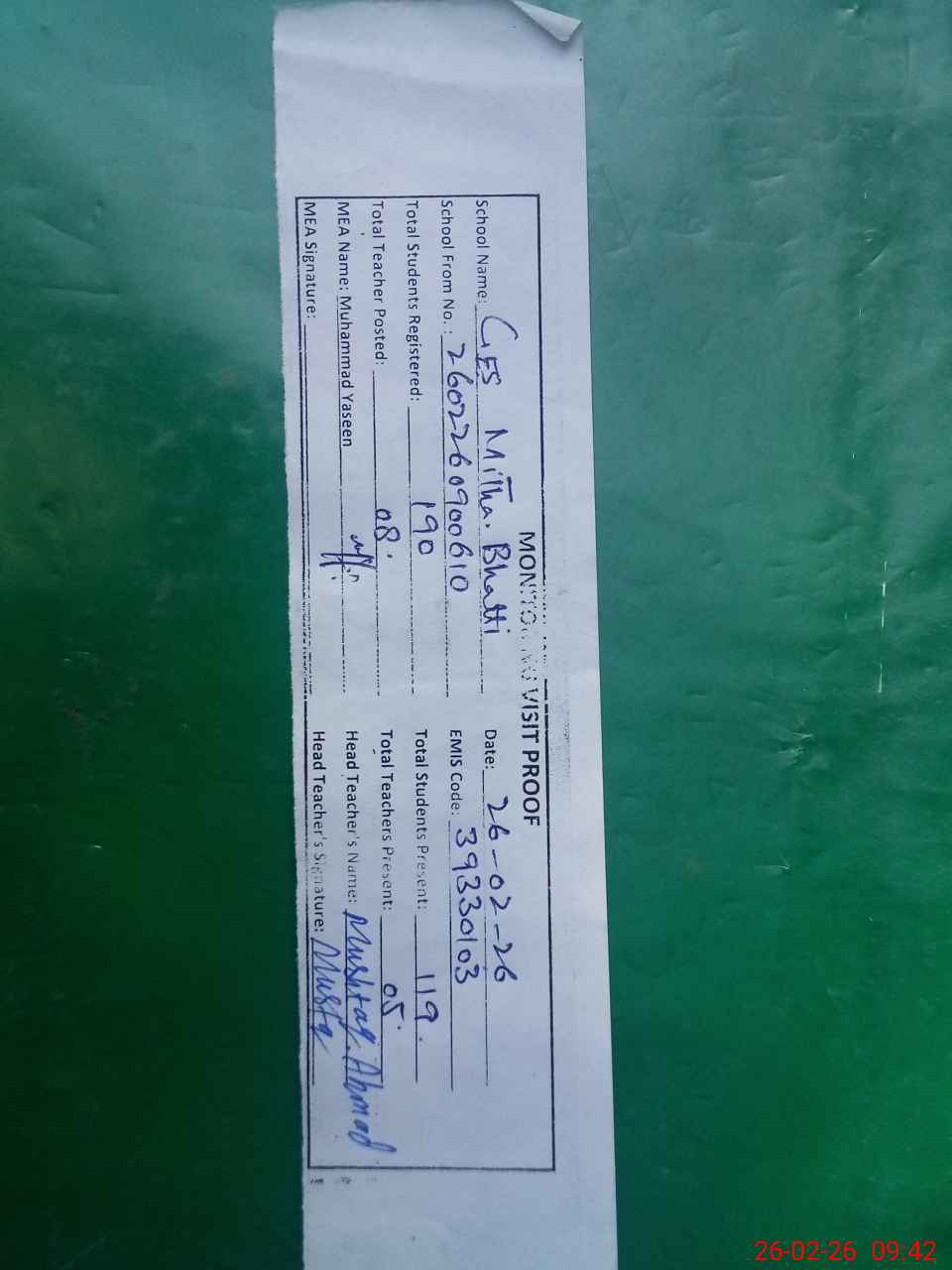 | Attendance Register | Head Teacher | MEA with School | Visit Proof |