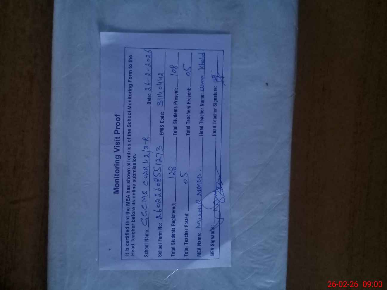 | Attendance Register | Head Teacher | MEA with School | Visit Proof |