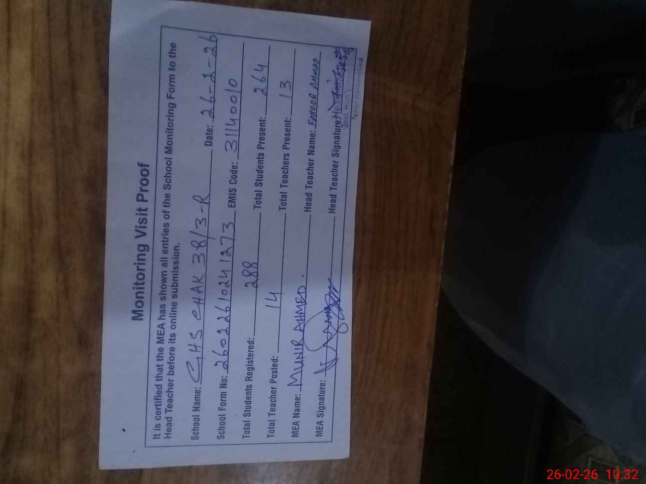 | Attendance Register | Head Teacher | MEA with School | Visit Proof |