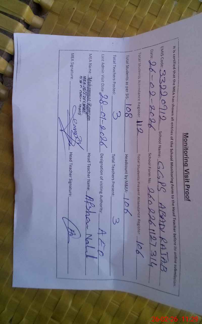 | EMIS Code: 33220912 | Name of School: GGPS ABADI RAJAB | |||