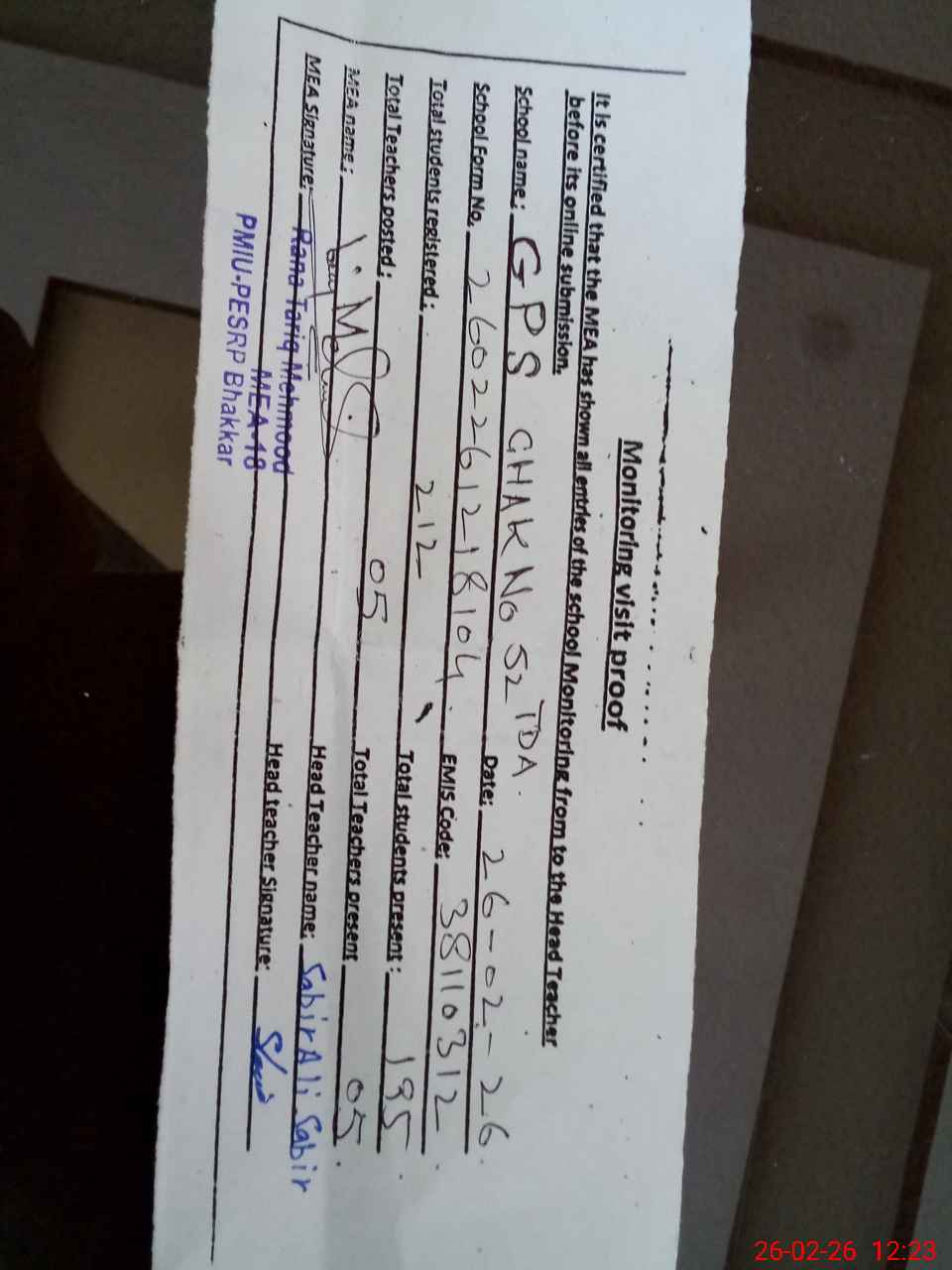 | EMIS Code: 38110312 | Name of School: GPS CHAK NO. 52/TDA | |||