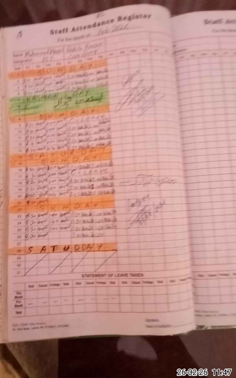 | CNIC | Full Name | Designation | R/C | Absence During Last Calender Month |