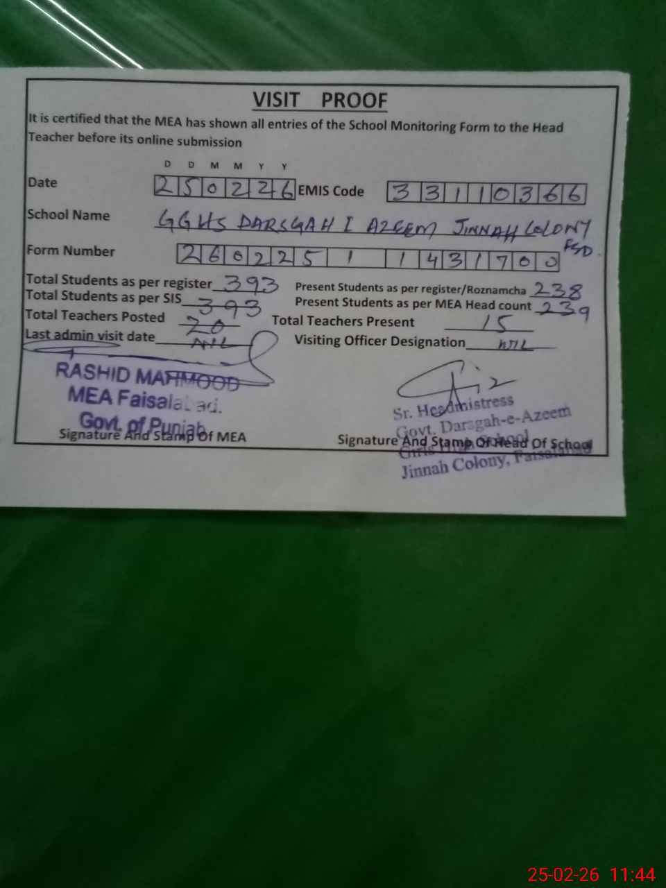 | Certified that this School was Inspected by the Undersigned MEA/DMO Today and the Information Stated Above is as Per Record. | |||||