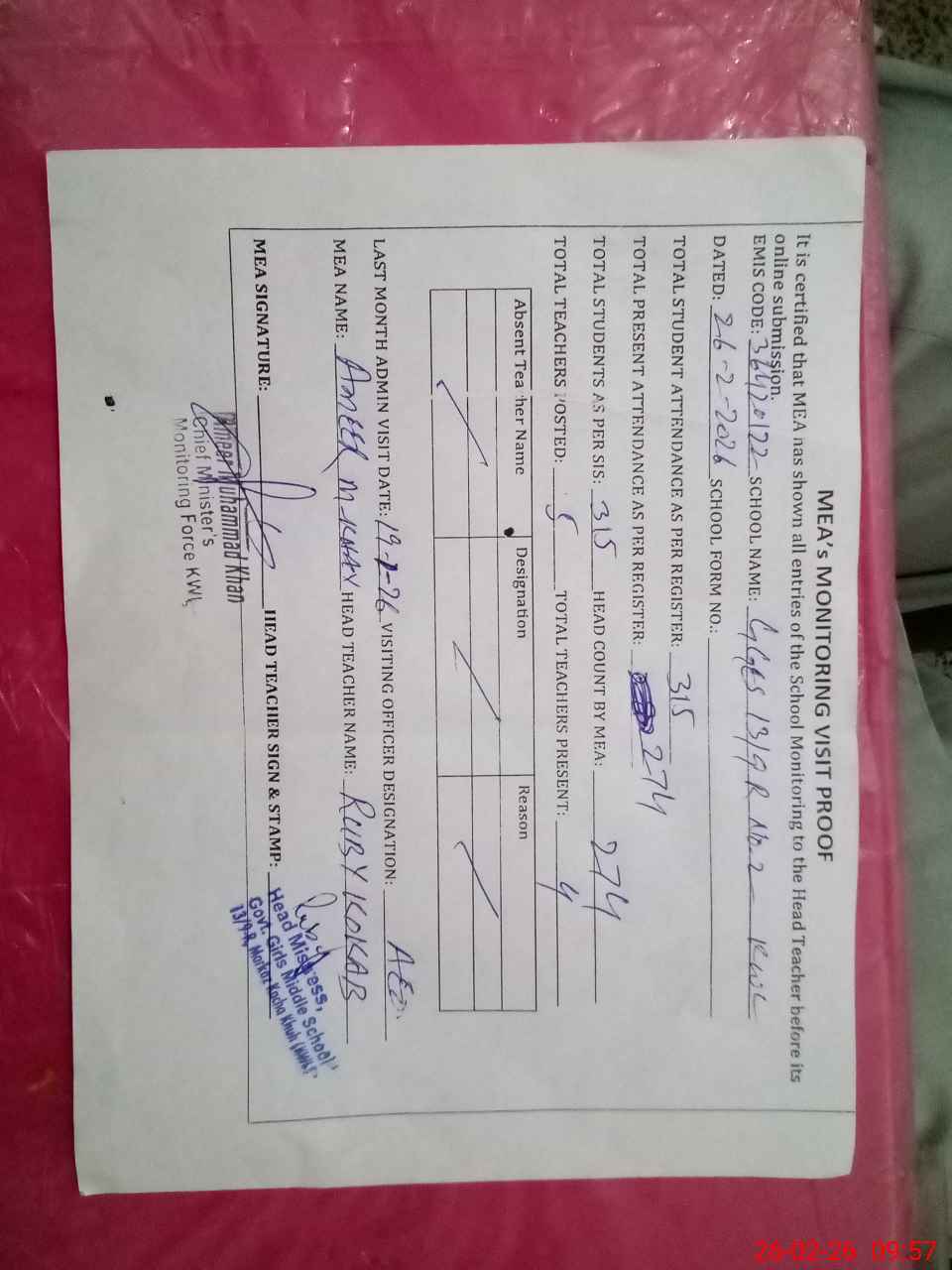| Attendance Register | Head Teacher | MEA with School | Visit Proof |