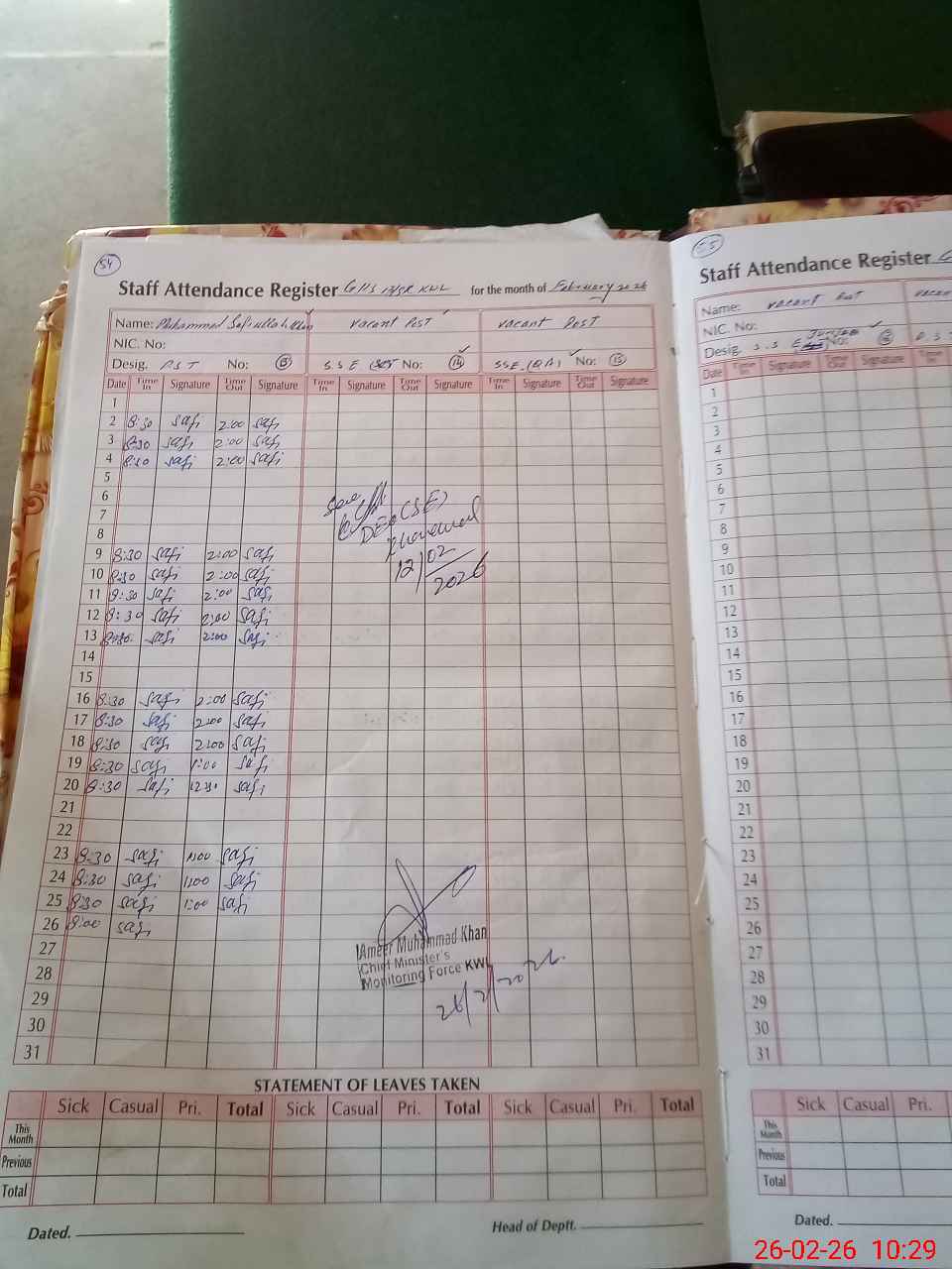 | Monitoring Date: 26-02-2026 | Start Time: 26-02-2026 10:05 AM | End Time: 26-02-2026 10:54 AM | Name of MEA: Am**** Mu**** Kh**** | |