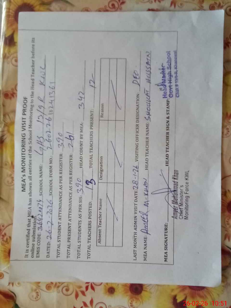 | Attendance Register | Head Teacher | MEA with School | Visit Proof |