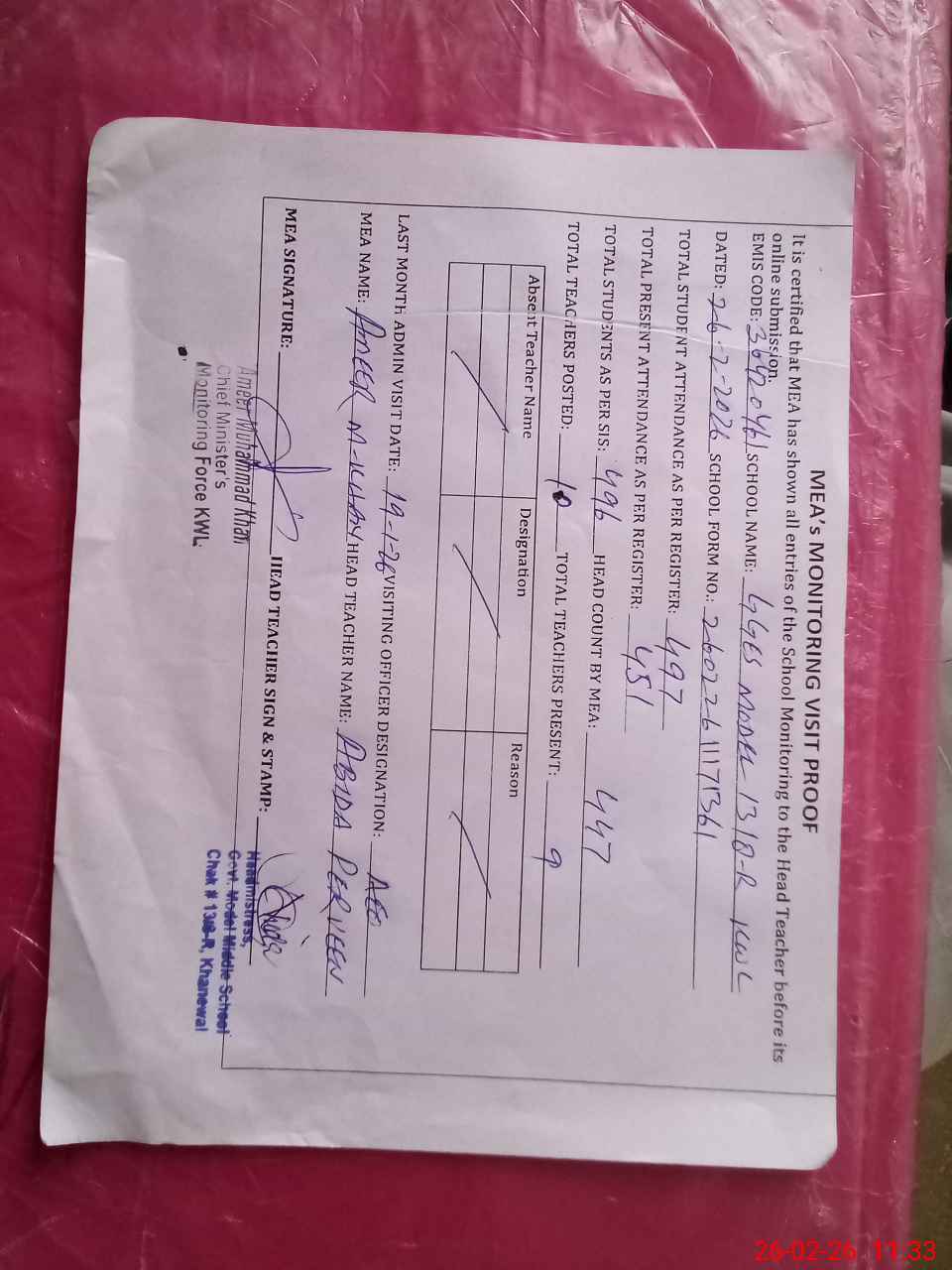 | Attendance Register | Head Teacher | MEA with School | Visit Proof |