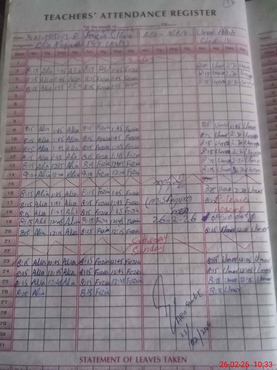 | CNIC | Full Name | Designation | R/C | Absence During Last Calender Month |