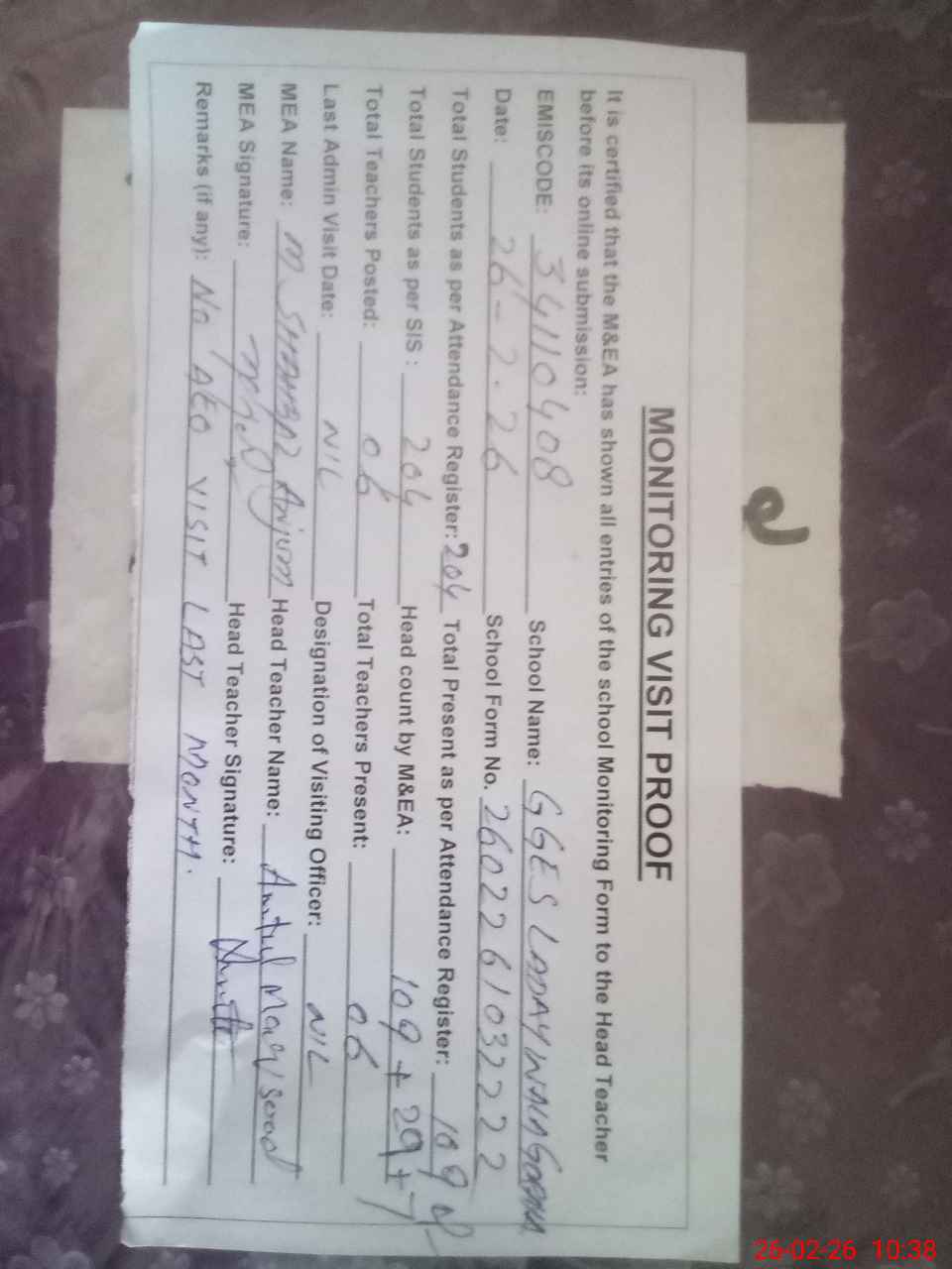 | Monitoring Date: 26-02-2026 | Start Time: 26-02-2026 08:40 AM | End Time: 26-02-2026 10:40 AM | Name of MEA: S-**** Sh**** An**** | |