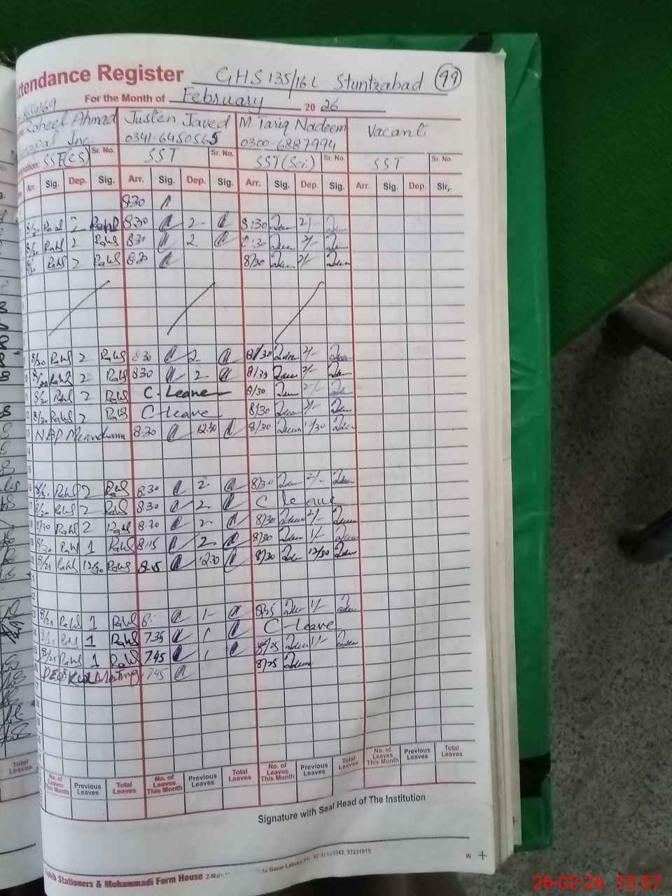| CNIC | Full Name | Designation | R/C | Absence During Last Calender Month |