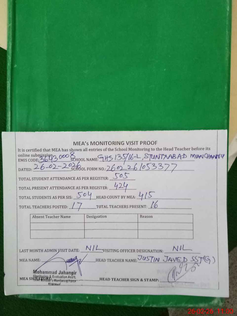 | Attendance Register | Head Teacher | MEA with School | Visit Proof |