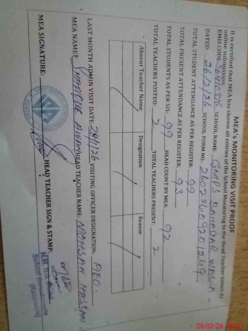 | Attendance Register | Head Teacher | MEA with School | Visit Proof |