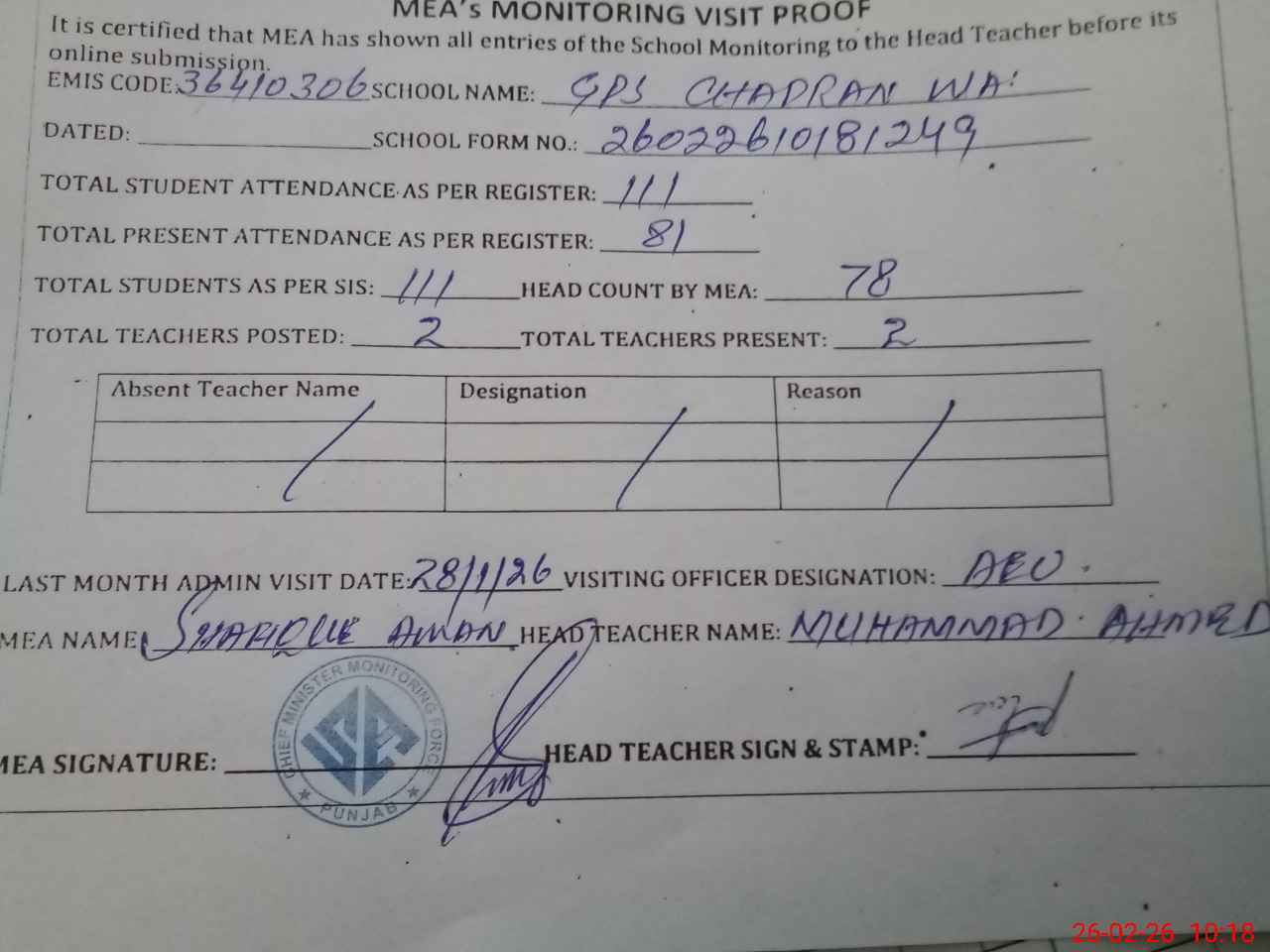 | Attendance Register | Head Teacher | MEA with School | Visit Proof |