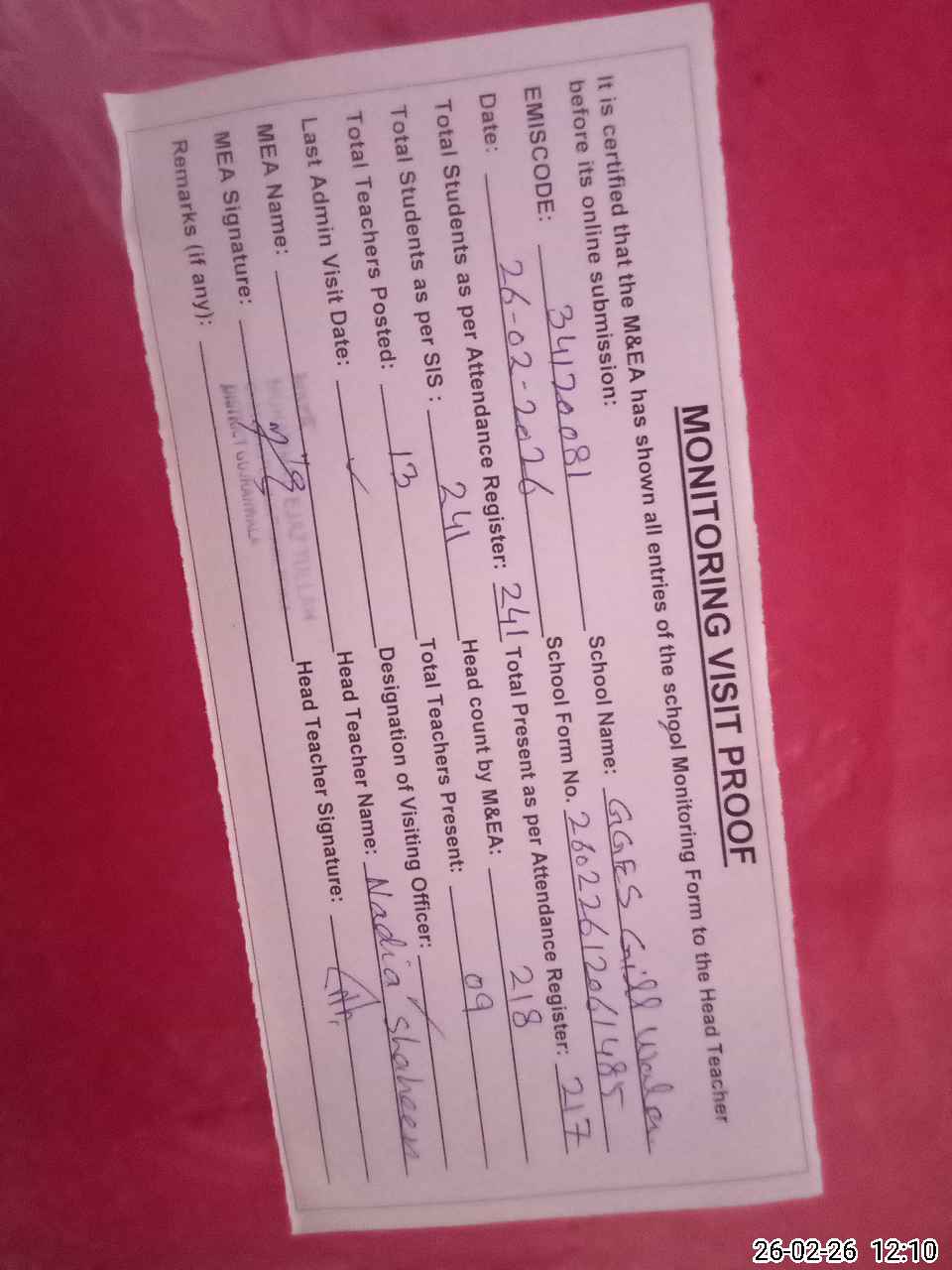 | Attendance Register | Head Teacher | MEA with School | Visit Proof |