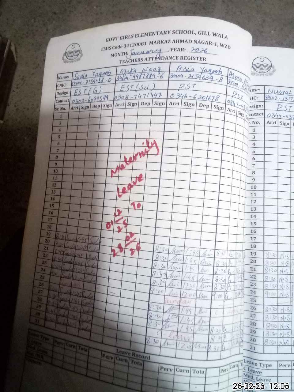 | 34**** | Af**** Na**** | EST (Math) | Regular | 0 | 0 | 0 | 0 | 0 | 0 | 0 | 0 | 0 | Maternity |