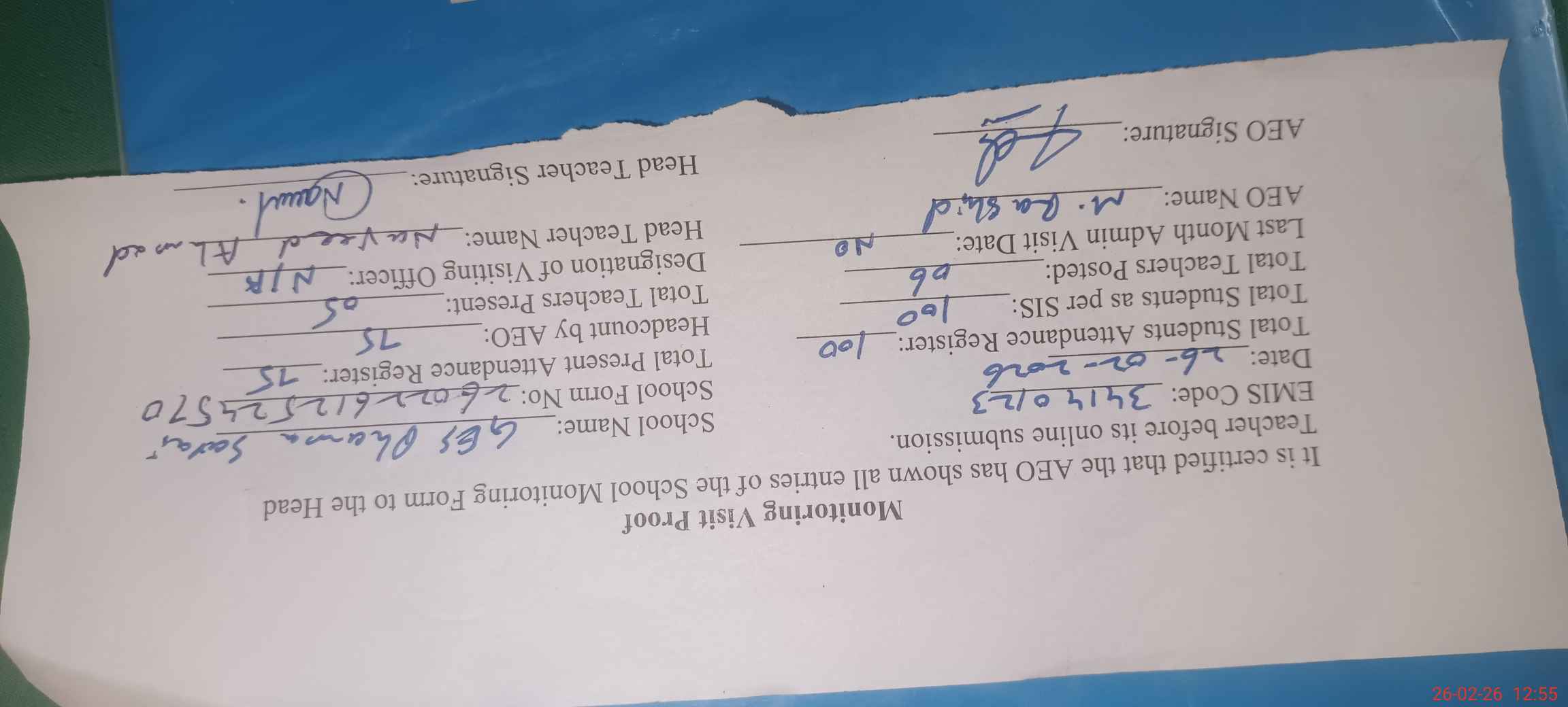 | Certified that this School was Inspected by the Undersigned MEA/DMO Today and the Information Stated Above is as Per Record. | |||||