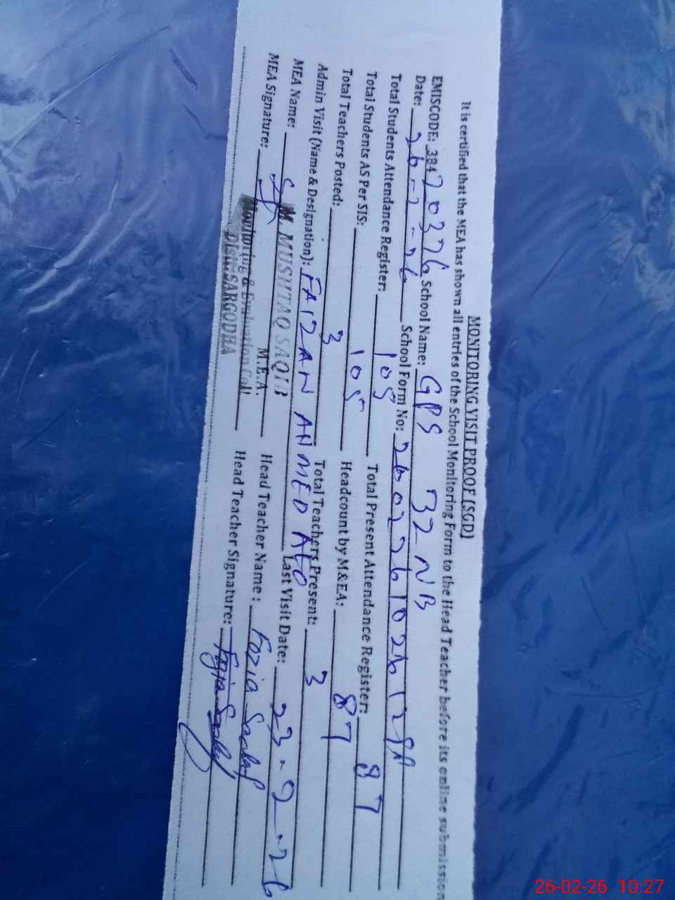 | Attendance Register | Head Teacher | MEA with School | Visit Proof |