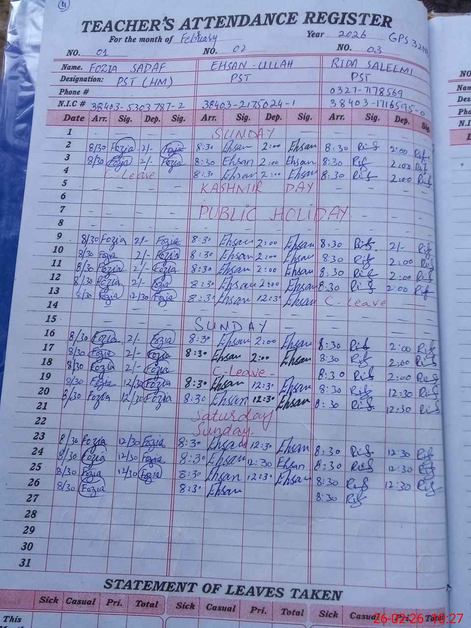 | CNIC | Full Name | Designation | R/C | Absence During Last Calender Month |