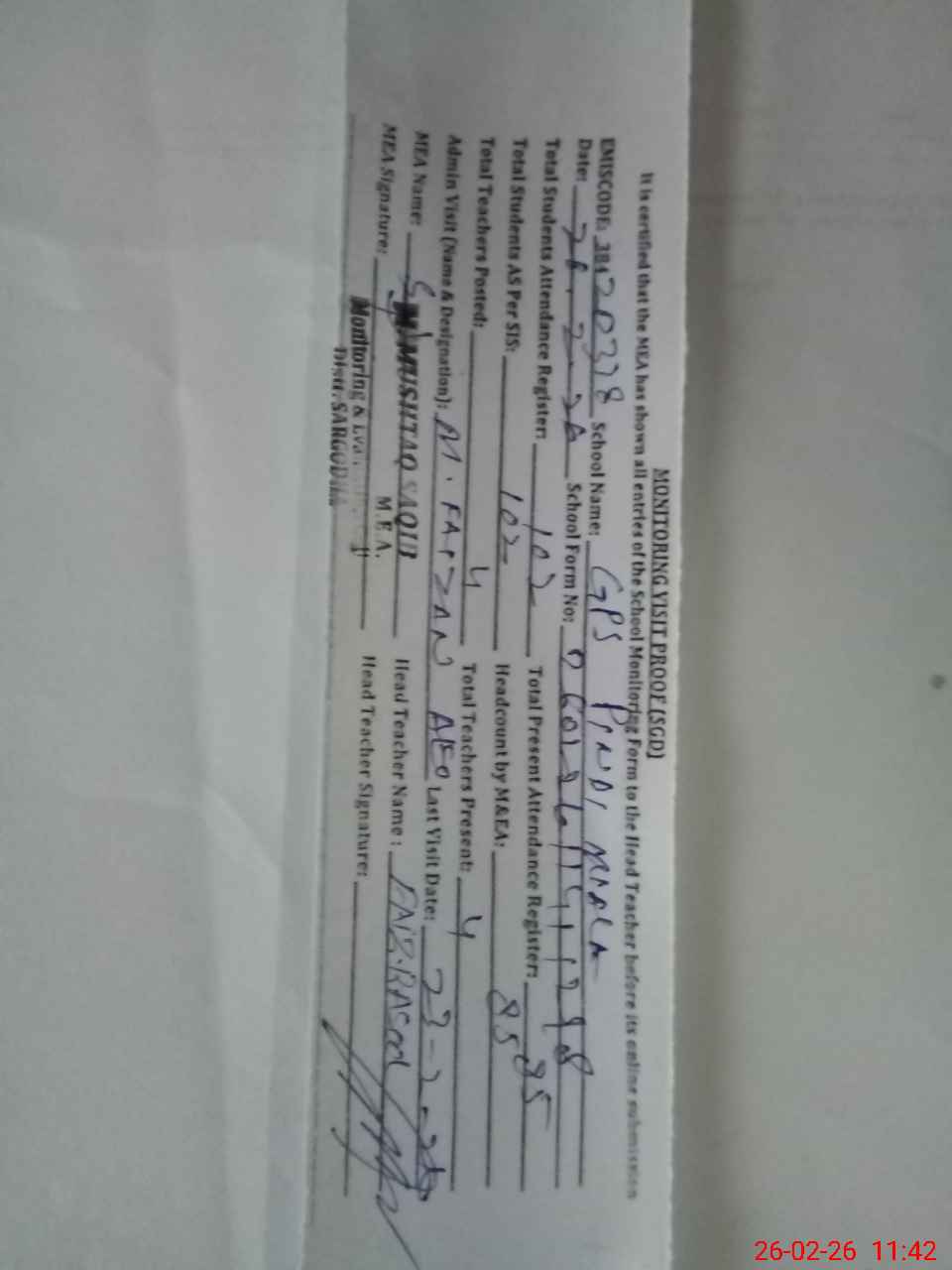 | Attendance Register | Head Teacher | MEA with School | Visit Proof |