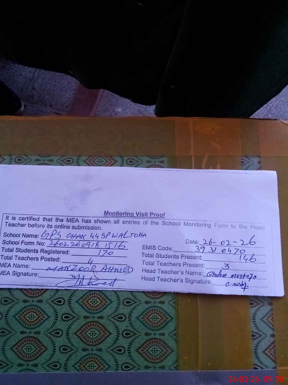 | Monitoring Date: 26-02-2026 | Start Time: 26-02-2026 09:18 AM | End Time: 26-02-2026 09:50 AM | Name of MEA: MA**** AH**** | |