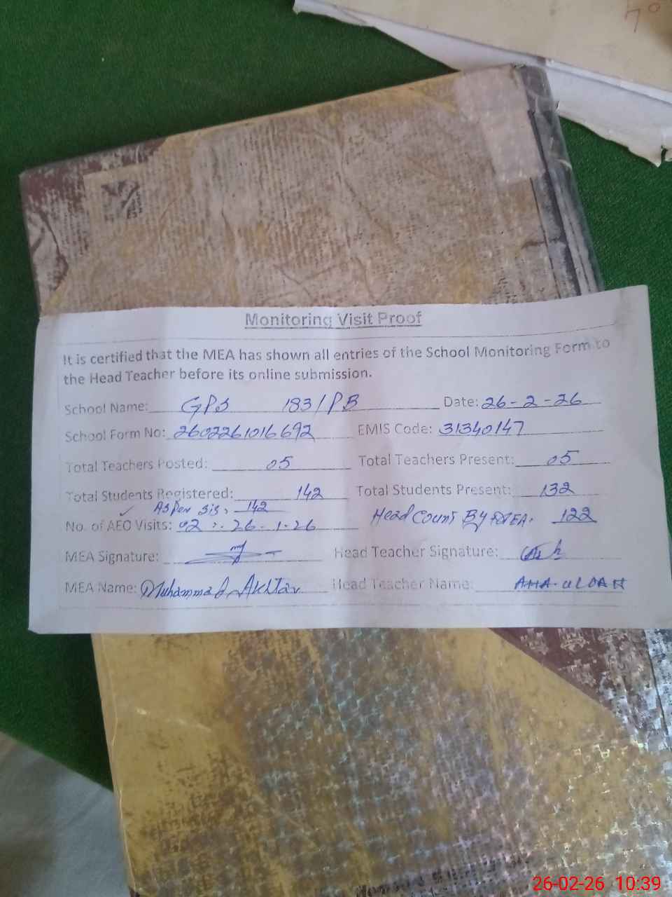 | Attendance Register | Head Teacher | MEA with School | Visit Proof |