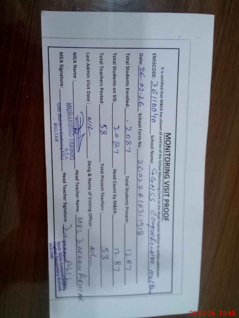 | Attendance Register | Head Teacher | MEA with School | Visit Proof |