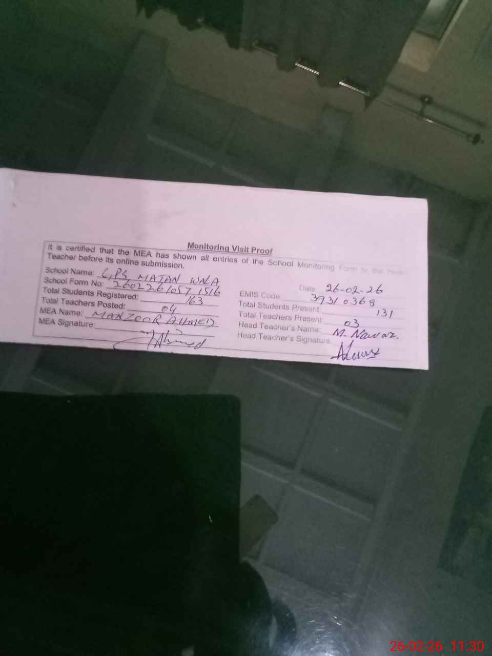 | Monitoring Date: 26-02-2026 | Start Time: 26-02-2026 10:57 AM | End Time: 26-02-2026 11:31 AM | Name of MEA: MA**** AH**** | |
