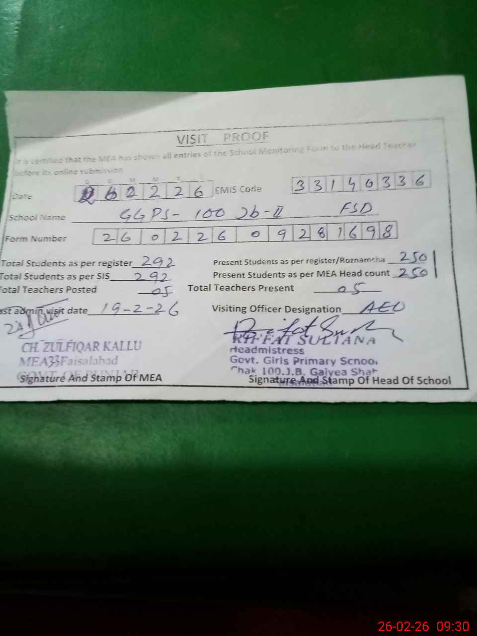 | Attendance Register | Head Teacher | MEA with School | Visit Proof |