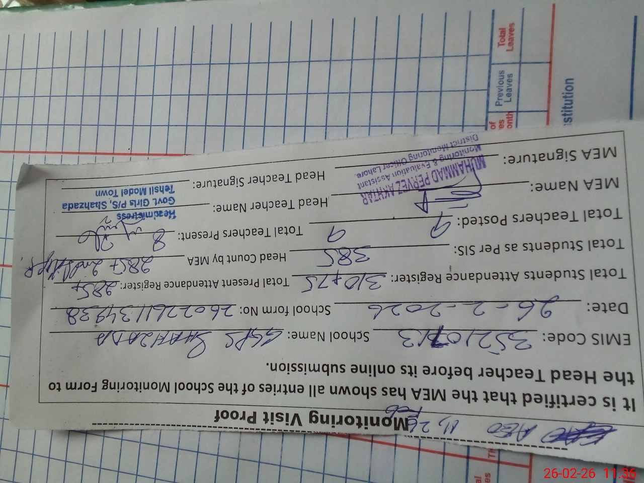 | Monitoring Date: 26-02-2026 | Start Time: 26-02-2026 11:06 AM | End Time: 26-02-2026 11:36 AM | Name of MEA: M.**** AK**** | |