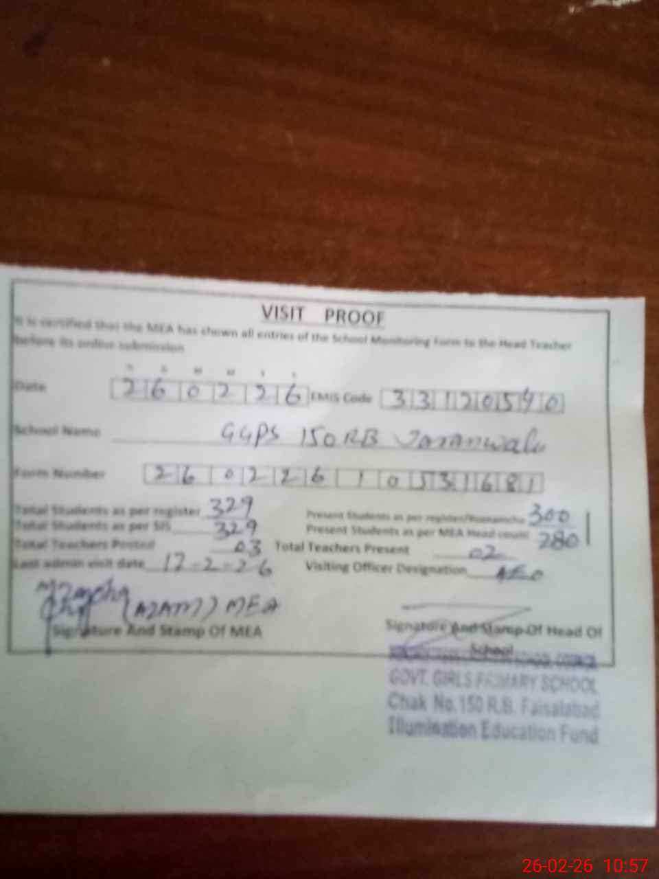 | Attendance Register | Head Teacher | MEA with School | Visit Proof |