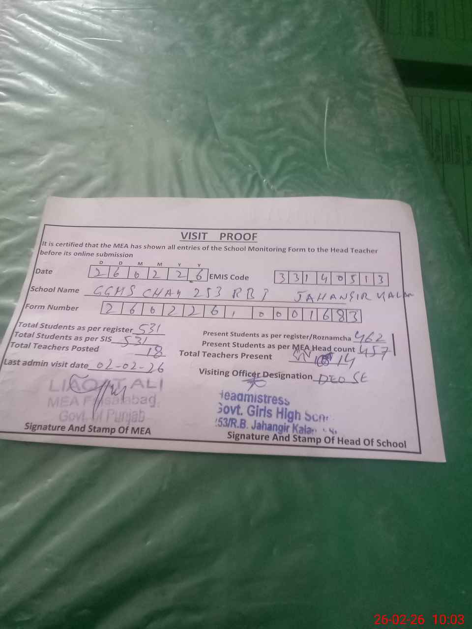 | EMIS Code: 33140513 | Name of School: GGHS CHAK 253 RB 1 JAHANGIR KALAN | |||