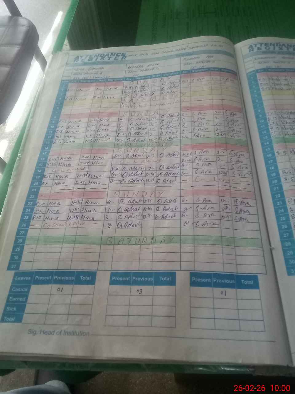 | 33**** | Sa**** Ra**** | Sr. Headmaster | Regular | 0 | 0 | 0 | 0 | 0 | 0 | 0 | 0 | 0 | Present (Latecomer) |
