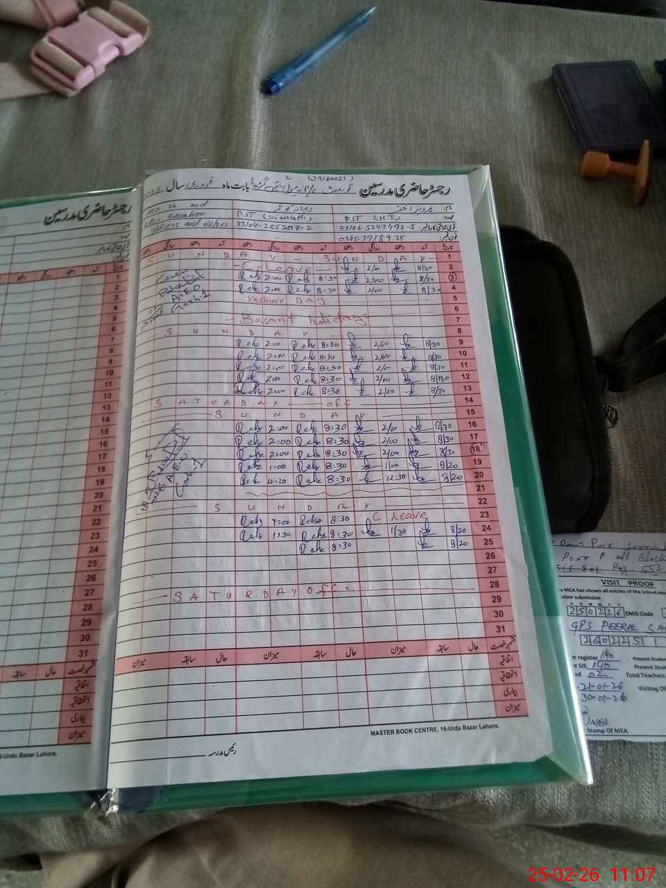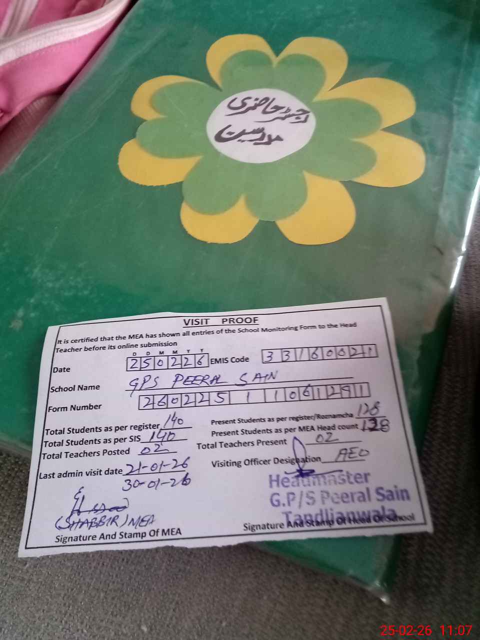 | Attendance Register | Head Teacher | MEA with School | Visit Proof |