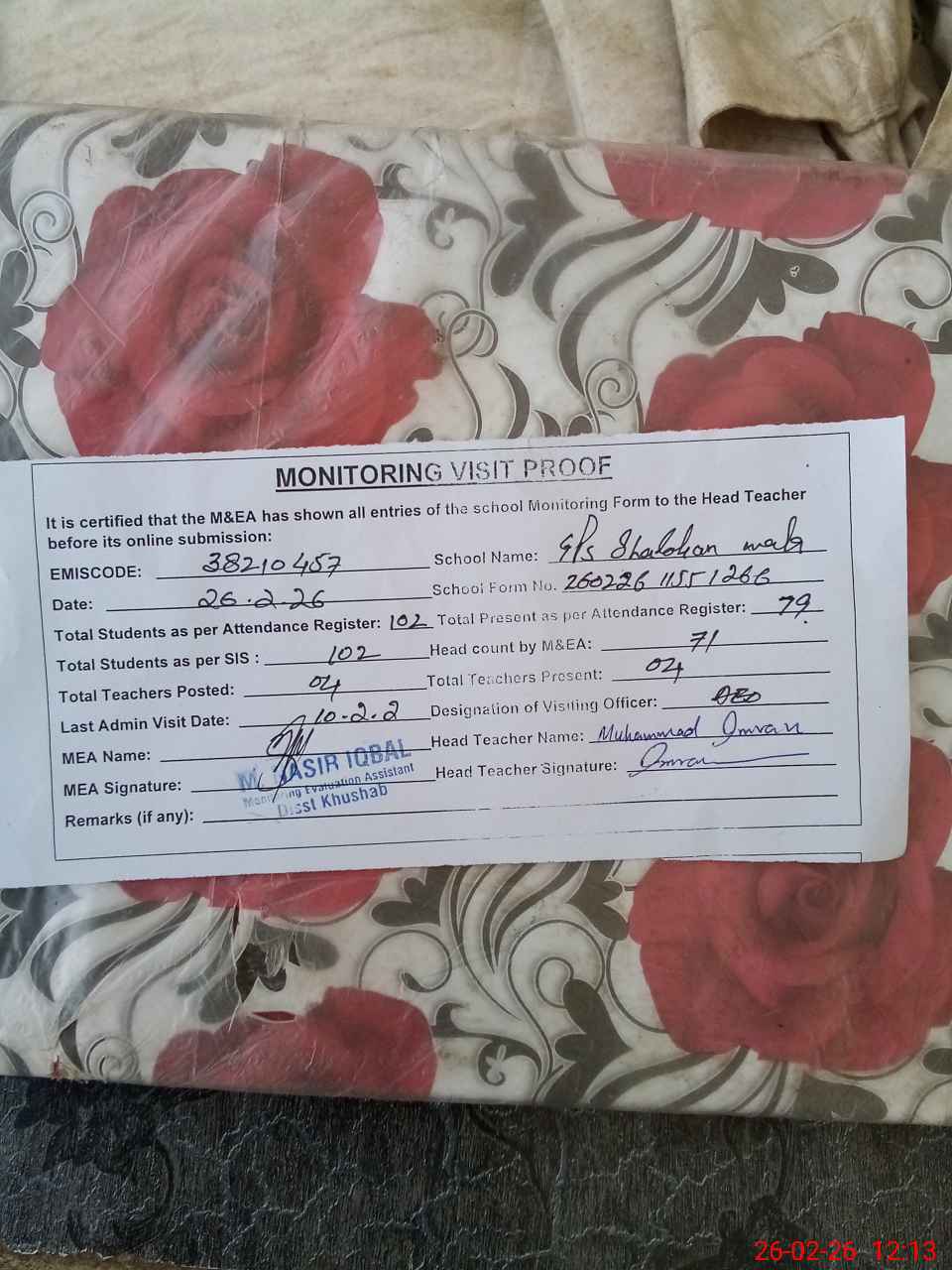 | EMIS Code: 38210457 | Name of School: GPS SHALOLIAN WALA | |||