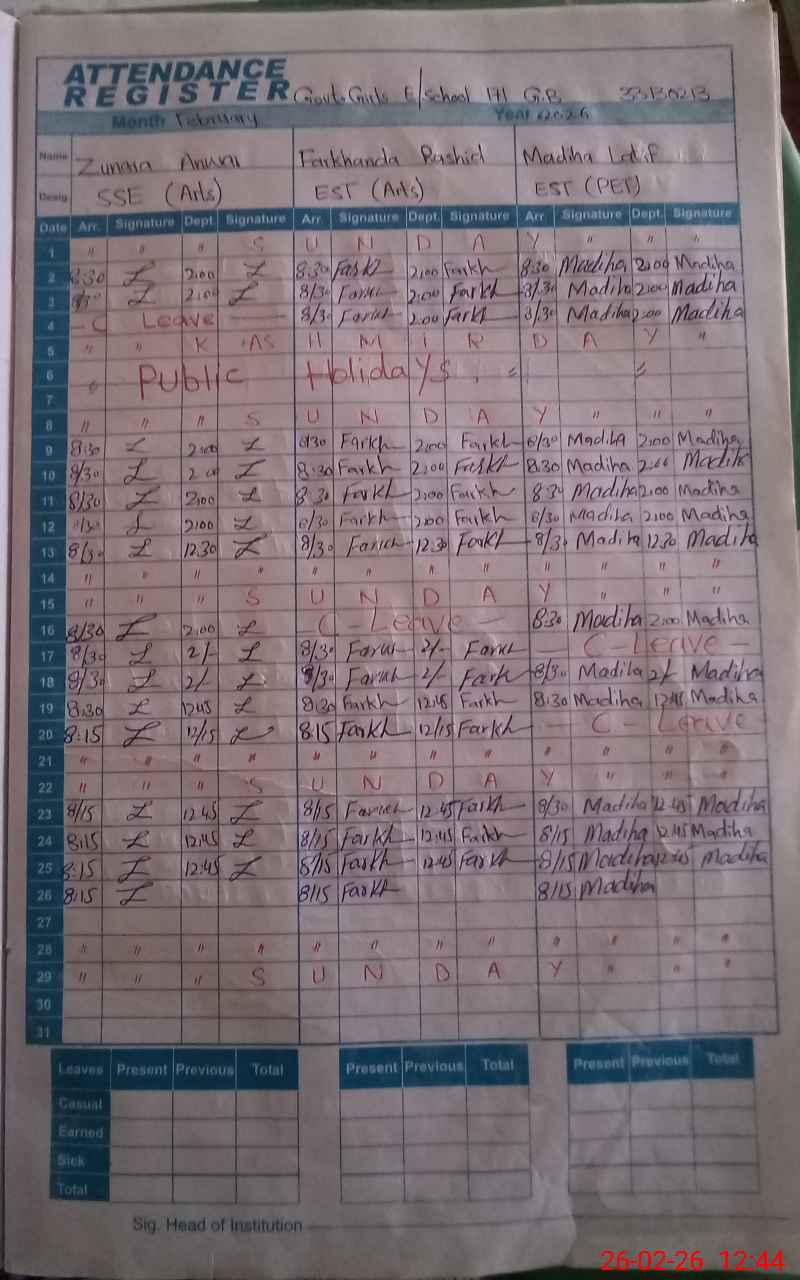 | CNIC | Full Name | Designation | R/C | Absence During Last Calender Month |