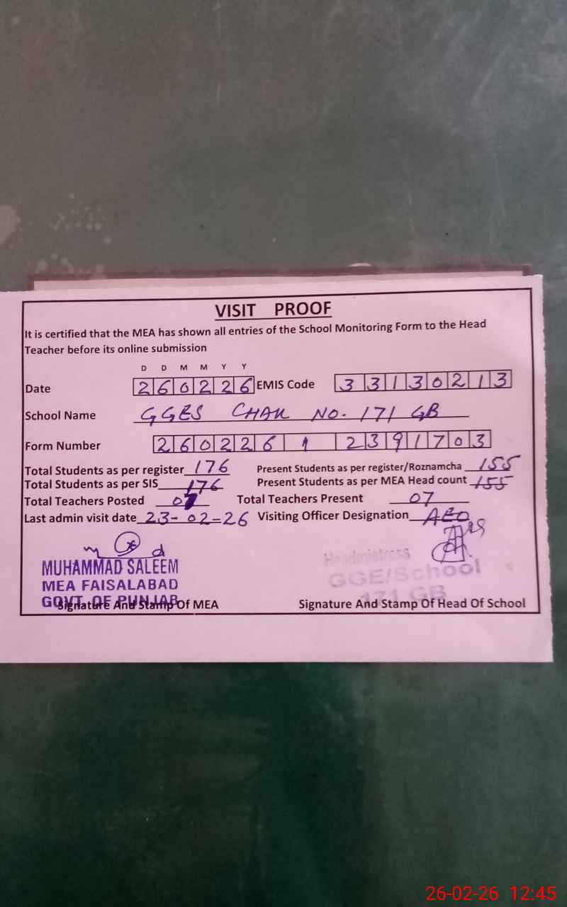 | EMIS Code: 33130213 | Name of School: GGES CHAK 171 GB SAMUNDRI | |||