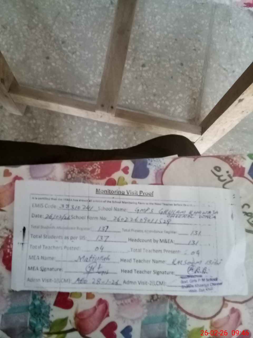 | Attendance Register | Head Teacher | MEA with School | Visit Proof |