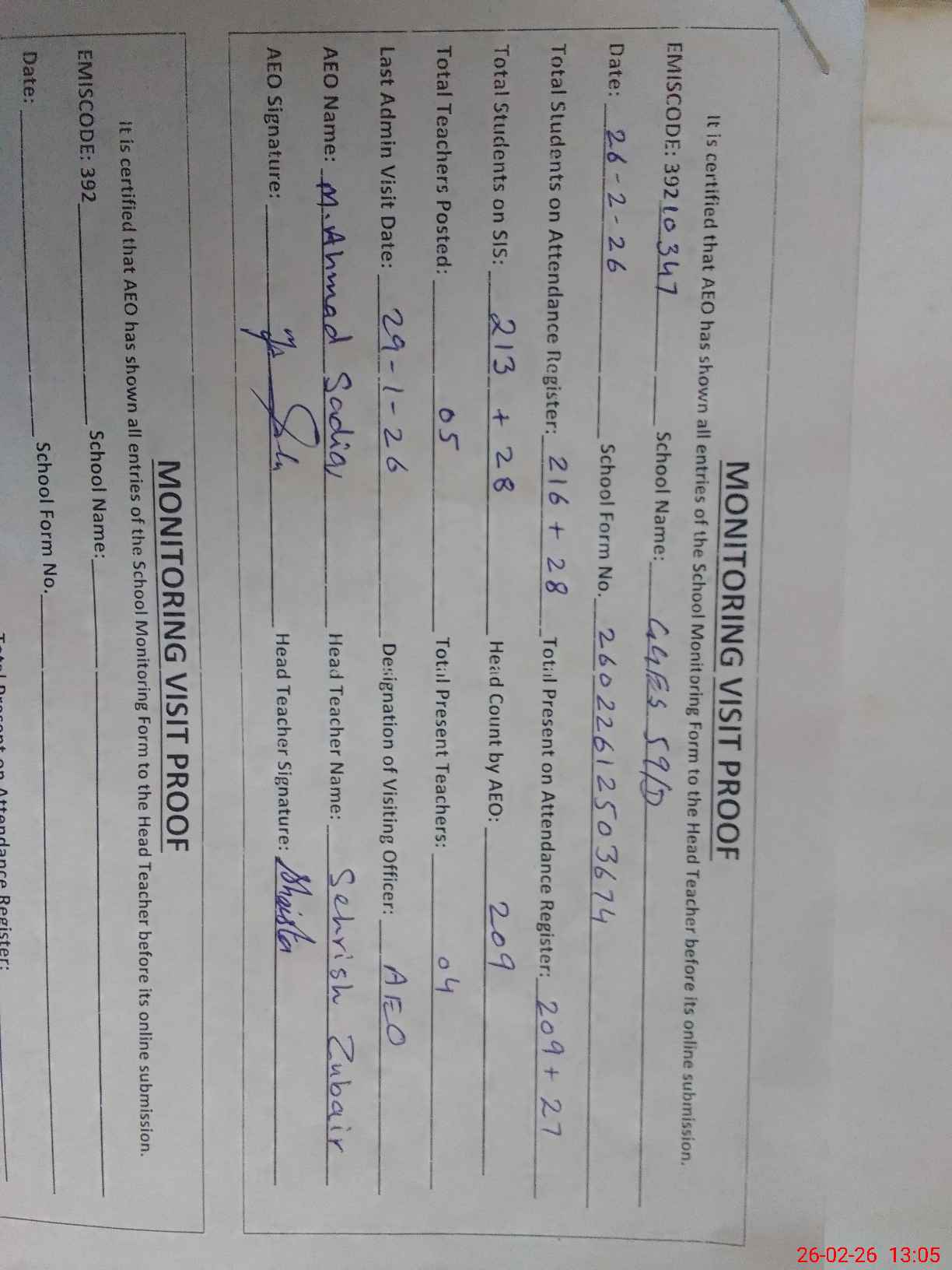 | Certified that this School was Inspected by the Undersigned MEA/DMO Today and the Information Stated Above is as Per Record. | |||||