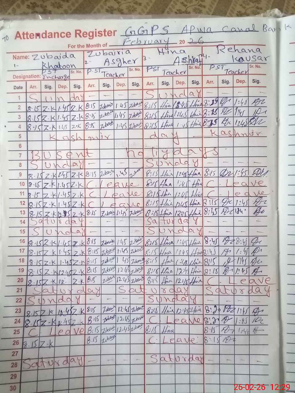 | Remarks (Use Separate Page if Required): 1 PST REHANA KOUSAR NOT PRESENT IN SCHOOL SO MARKED HER ABSENT BUT IN ATTENDANCE REGISTER SHOWS PRESENT. 2..Non Teaching Staff, SG Mr Ghafar marked absent due to non availability. | |||||