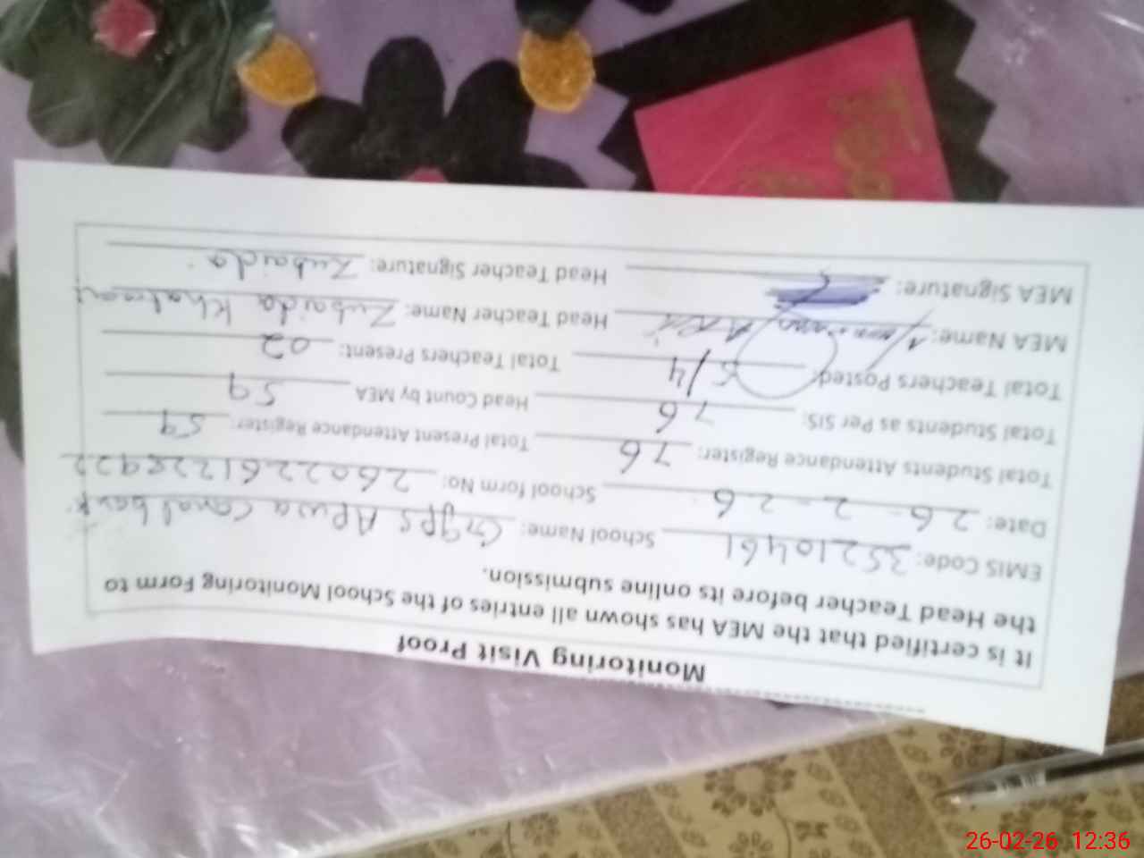 | Attendance Register | Head Teacher | MEA with School | Visit Proof |