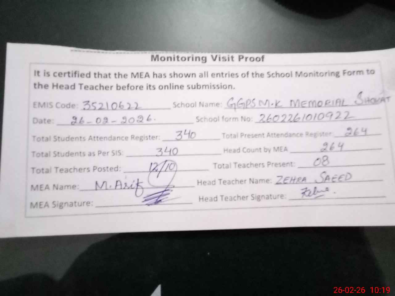| EMIS Code: 35210622 | Name of School: GGPS MK MEMORIAL SHOUKAT TOWN | |||