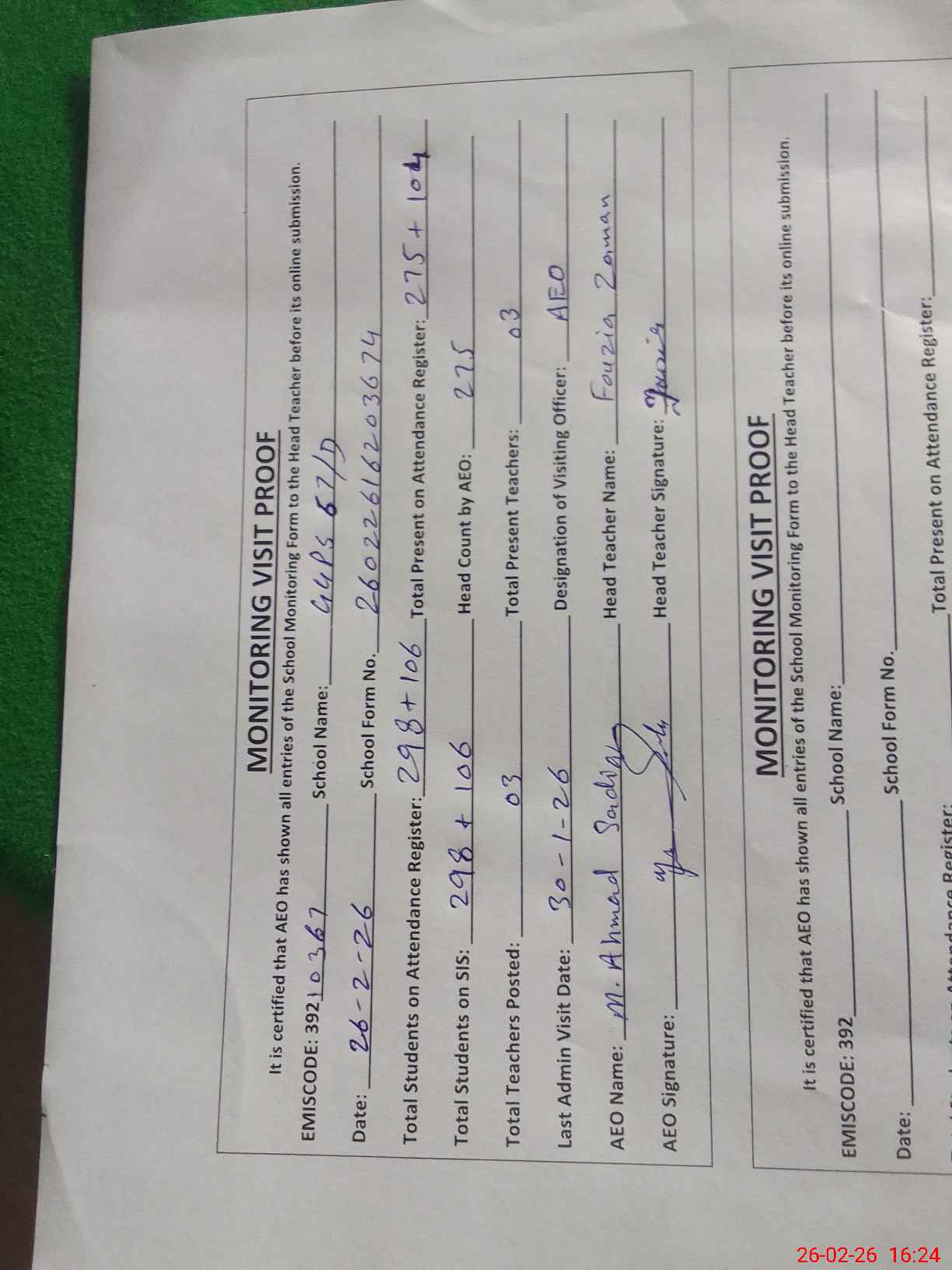 | Certified that this School was Inspected by the Undersigned MEA/DMO Today and the Information Stated Above is as Per Record. | |||||