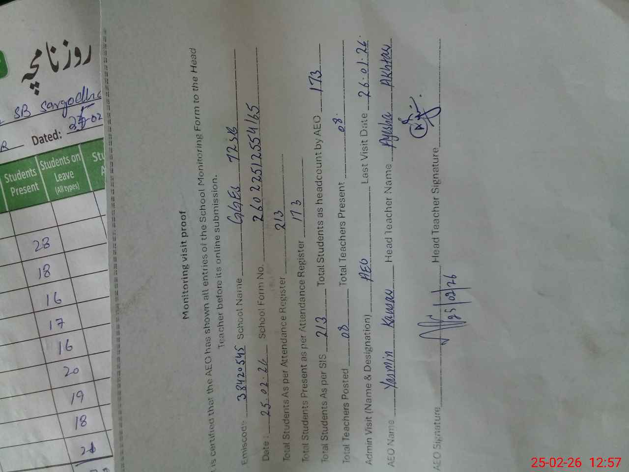 | Attendance Register | Head Teacher | MEA with School | Visit Proof |