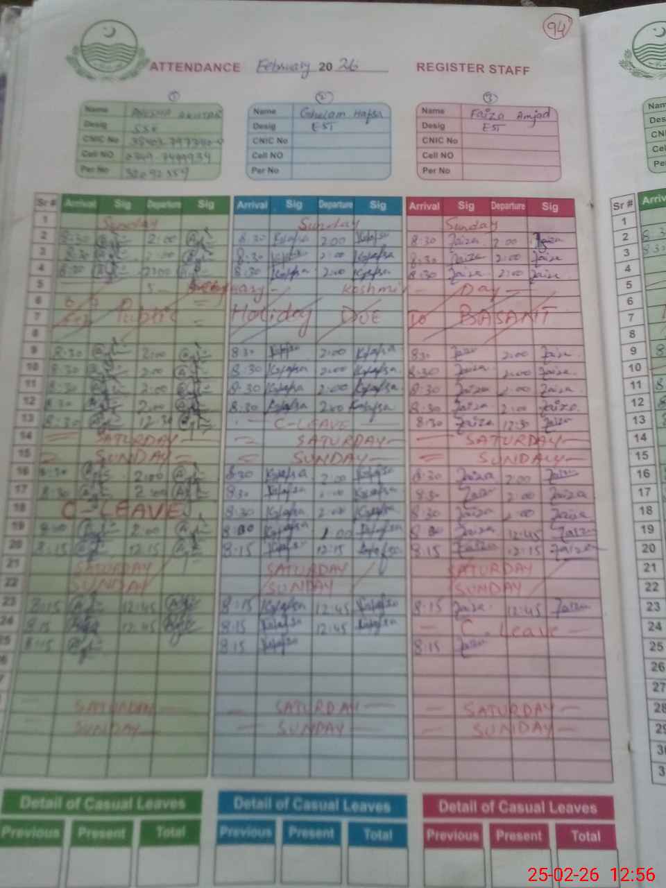 | CNIC | Full Name | Designation | R/C | Absence during last cal. month |