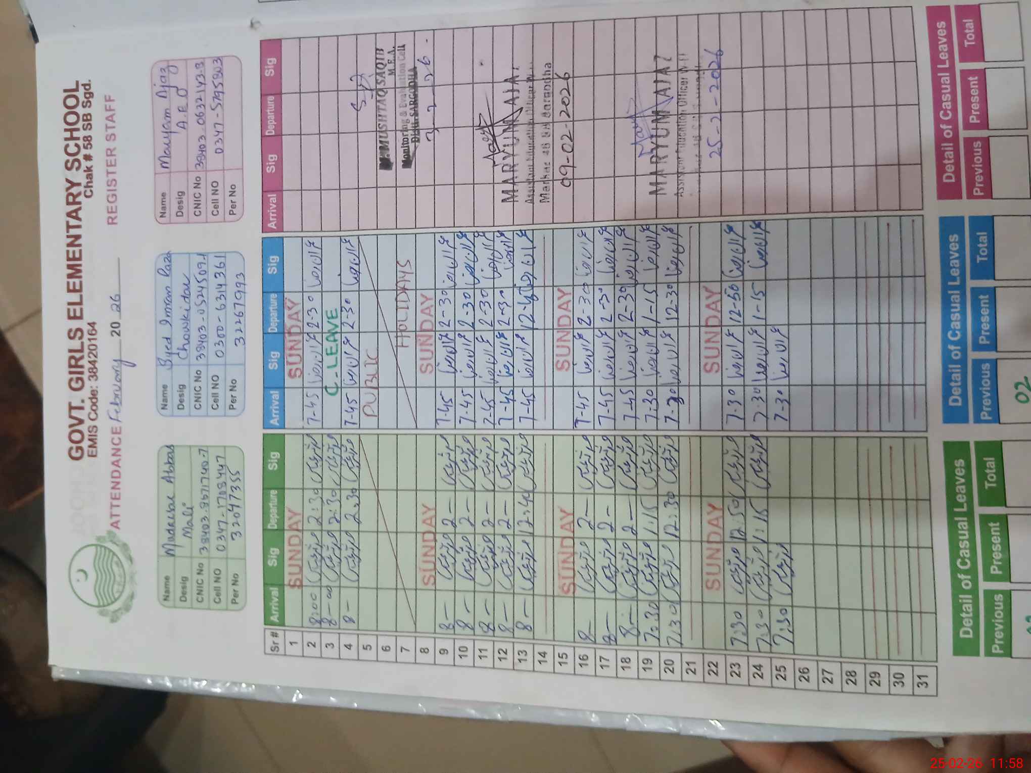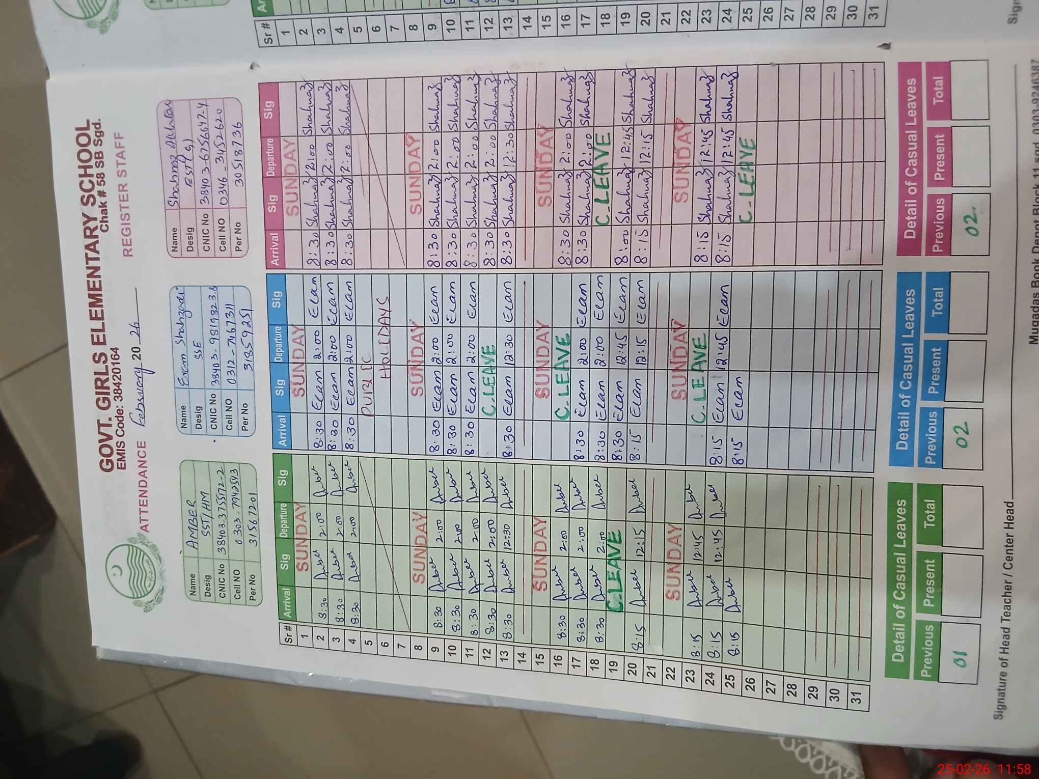 | CNIC | Full Name | Designation | R/C | Absence During Last Calender Month |
