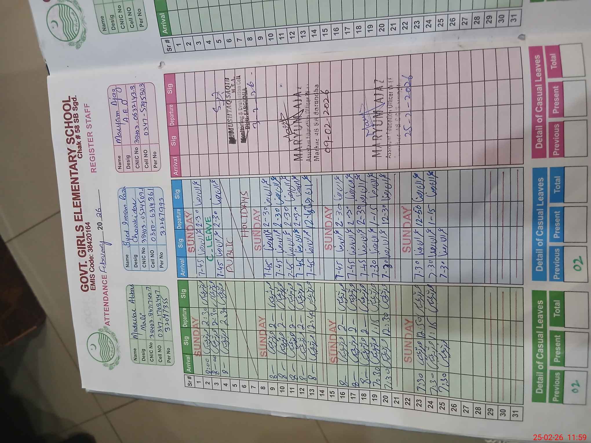 | CNIC | Full Name | Designation | R/C | Absence during last cal. month |