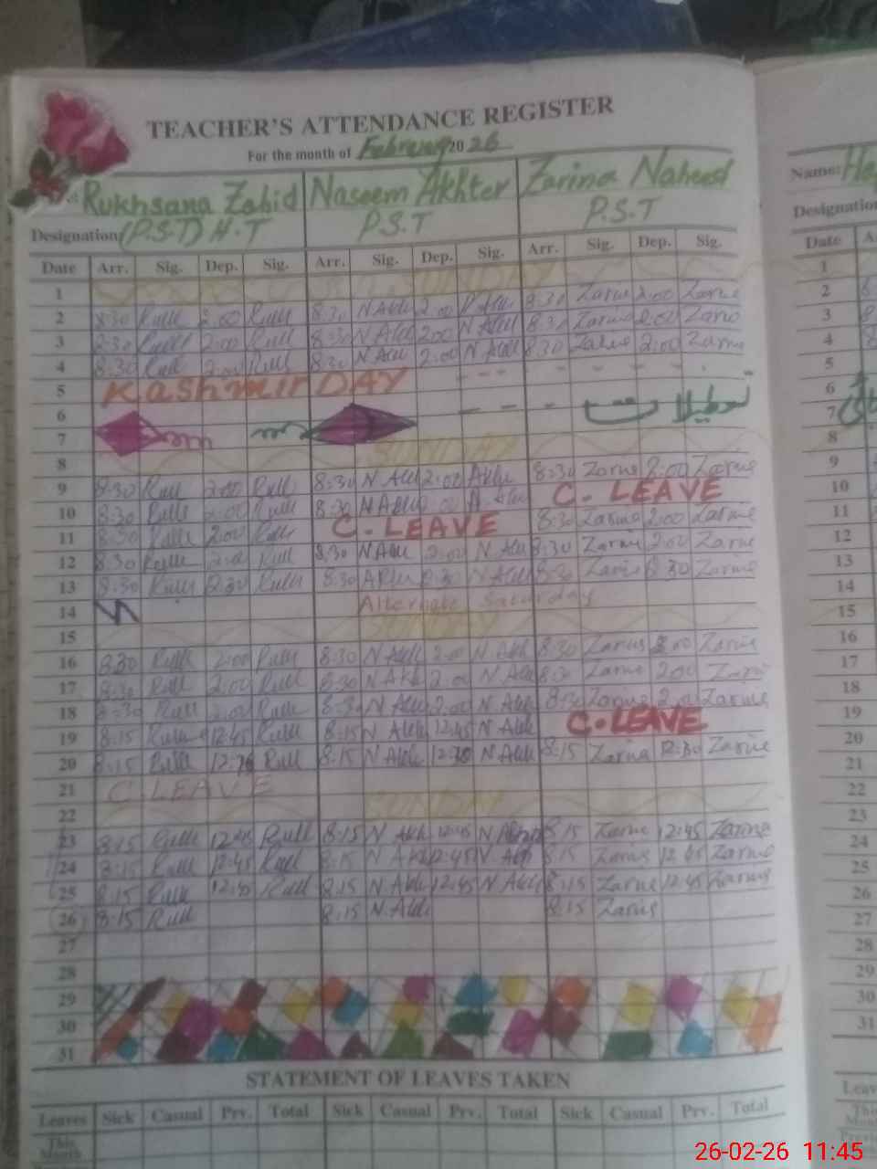 | Leave | Duty | Absent | Maternity | Medical | Ex- Pak |