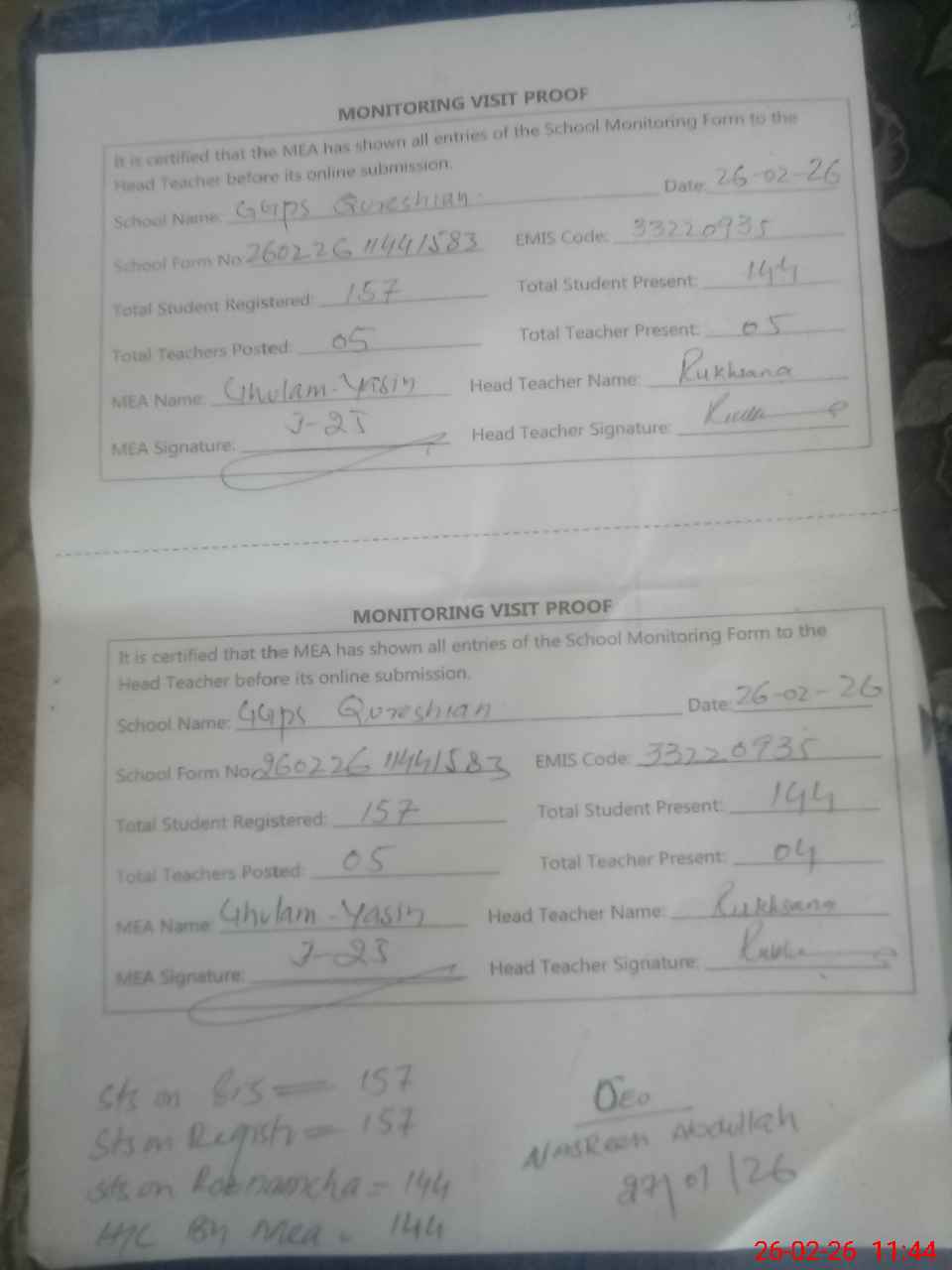 | Attendance Register | Head Teacher | MEA with School | Visit Proof |