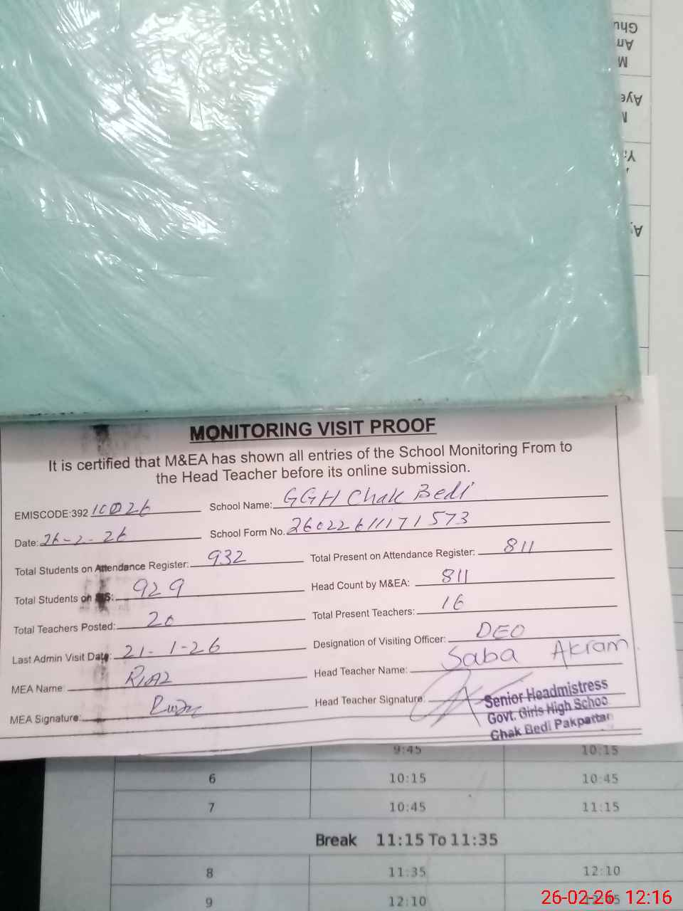 | Attendance Register | Head Teacher | MEA with School | Visit Proof |