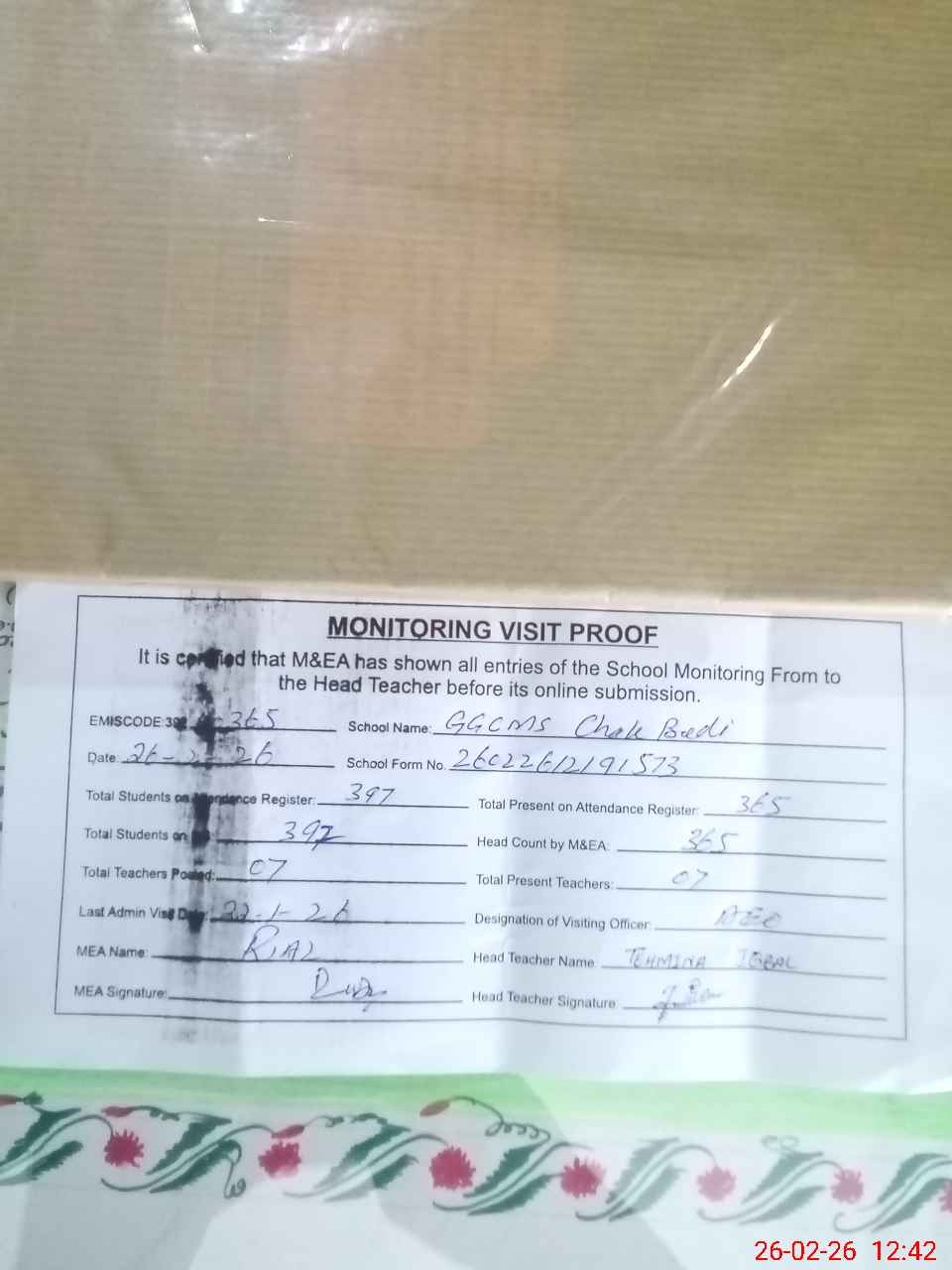 | EMIS Code: 39210365 | Name of School: GGCMS CHAK BEDI | |||